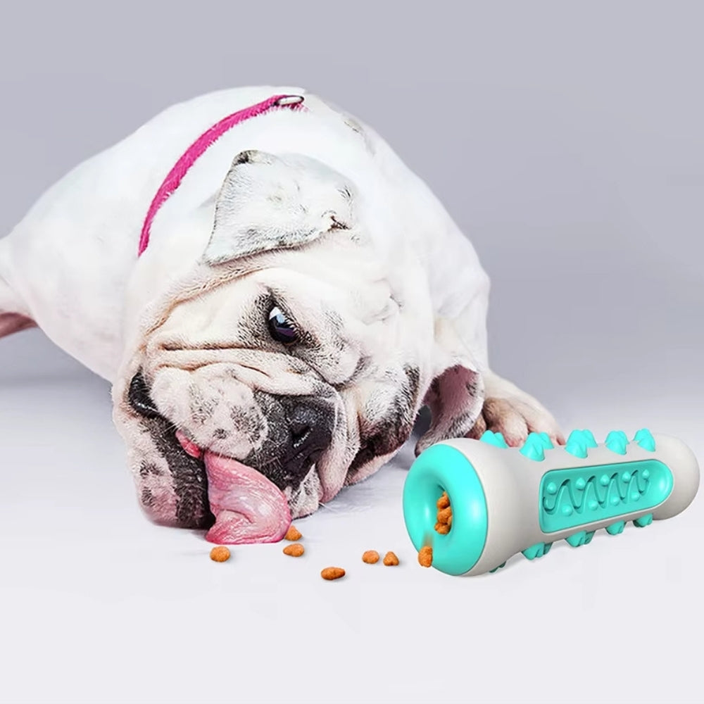 DentaClean är ett tuggbart TPR-ben som kombinerar lek, tandborstning och godisdispens i ett. De flexibla borsthålen rengör tänderna medan hunden tuggar, masserar tandköttet och minskar plack. I den spiralformade mittkanalen kan du trycka in paste eller små godbitar för extra motivation – perfekt för både valpar och vuxna krafttuggare.