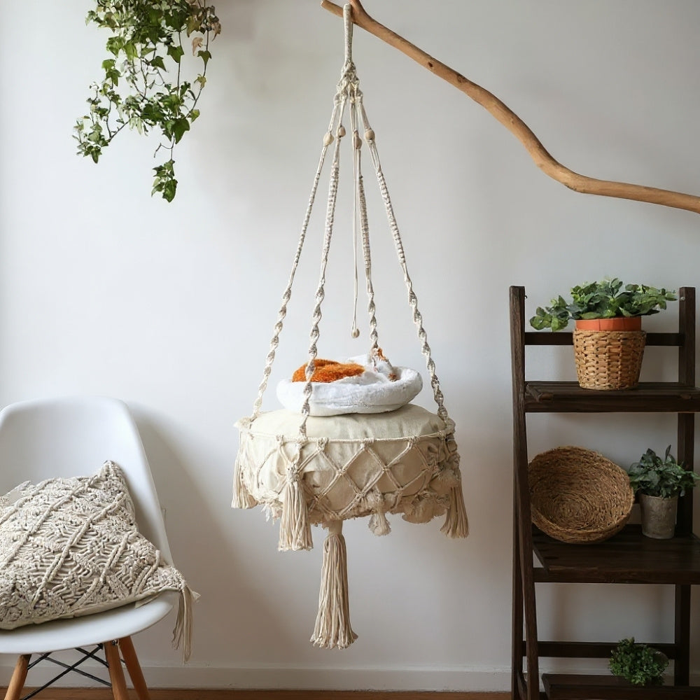 Ge katten en luftig utkikspunkt och ett stilrent inrednings statement på samma gång. Denna handvävda macramé-hängmatta i bomullsrep hänger säkert från takkrok eller väggarm och rymmer en rund kudde där katten kan kura ihop sig 135 cm ovan golvet. Den flätade designen svajar lätt vid rörelse och lockar fram kattens naturliga nyfikenhet, samtidigt som den sparar golvyta i mindre hem.